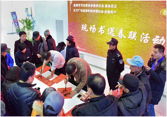 当日,一副副气势磅礴、刚劲有力、润朗俊逸的春联跃然纸上。市民闻讯纷纷赶来,场面热烈祥和温馨。盘锦分公司数十名员工全程参与活动,与新老用户亲切交流互动,向多年来给予有线电视事业支持与关爱的广大用户和市民以及现场挥毫泼墨的书法家们致以节日的问侯!纷纷表示,2017年盘锦分公司将继续支持和关爱盘锦的文化事业,继续以客户为中心,脚踏实地,开拓创新,以新网络、新功能、新服务为广大市民提供优质便捷的服务,为城市智慧化建设进程、文化事业的进步和传承以及盘锦市的经济社会建设提供一流服务。