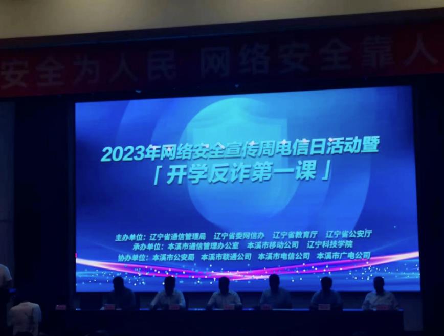 为深入贯彻落实习近平总书记重要指示批示精神,全面提升学生群体反诈意识,9月13日,2023年辽宁省网络安全宣传周“电信日”暨“开学反诈第一课”主题活动在本溪辽宁科技学院举办。活动由辽宁省通信管理局、辽宁省委网信办、辽宁省公安厅、辽宁省教育厅联合主办,本溪市通信管理办公室、本溪市移动公司、辽宁科技学院承办。主办单位有关领导出席活动,各基础电信企业反诈相关人员、学生代表等近200人参加活动。