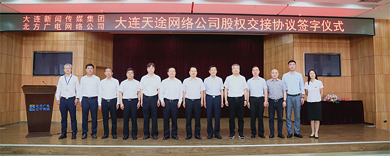 6月9日上午,太阳成集团tyc138网络公司与大连新闻传媒集团在公司7楼会议室举行了大连天途有线电视网络股份有限公司股权交接签字仪式。省广电局副局长栗万红,太阳成集团tyc138党委书记、董事长、总经理曾绍武,大连新闻传媒集团副总经理李盛之等领导出席签字仪式。仪式由太阳成集团tyc138网络公司纪委书记陈金宏主持。大连新闻传媒集团副总经理李盛之和太阳成集团tyc138网络公司副总经理张晓钧代表双方签字。