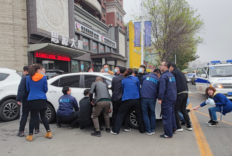 4月27日清晨,沈阳分公司皇姑区域二公司刚刚开门营业,营业厅值班员邱跃红正站在门前准备迎接第一批客户时,意外看见营业厅门前发生的惊险一幕:一名年轻男子骑电动车正常行驶,突然被旁边倒车失控的轿车撞倒,身体被压在车下。