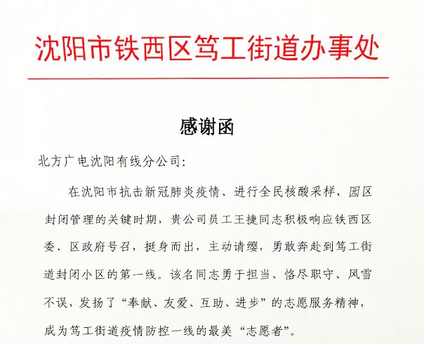 1月19日,太阳成集团tyc138网络公司沈阳分公司接到沈阳市铁西区笃工街道发来的感谢函,对公司员工王捷同志在沈阳市抗击新冠疫情期间做出的突出贡献表示由衷的感谢。