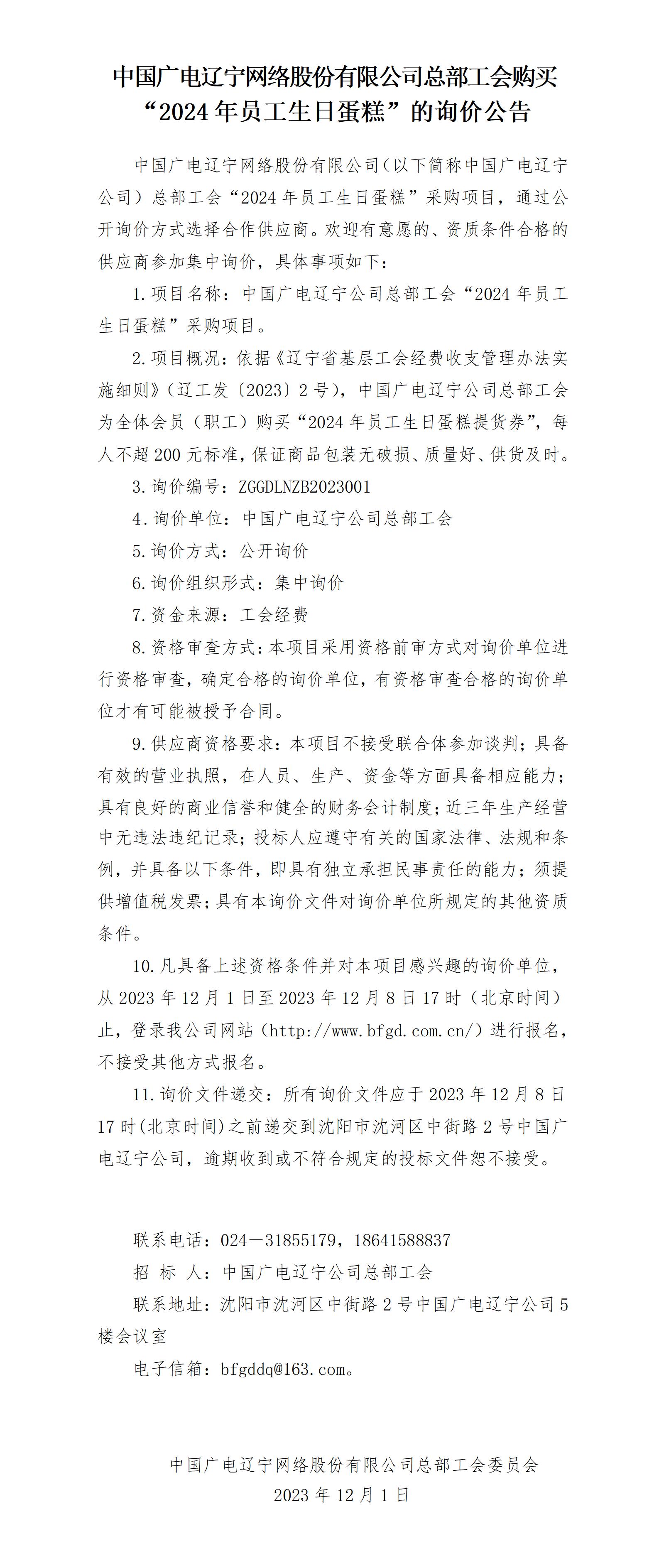 中国广电辽宁网络股份有限公司总部工会购买“2024年员工生日蛋糕”的询价公告