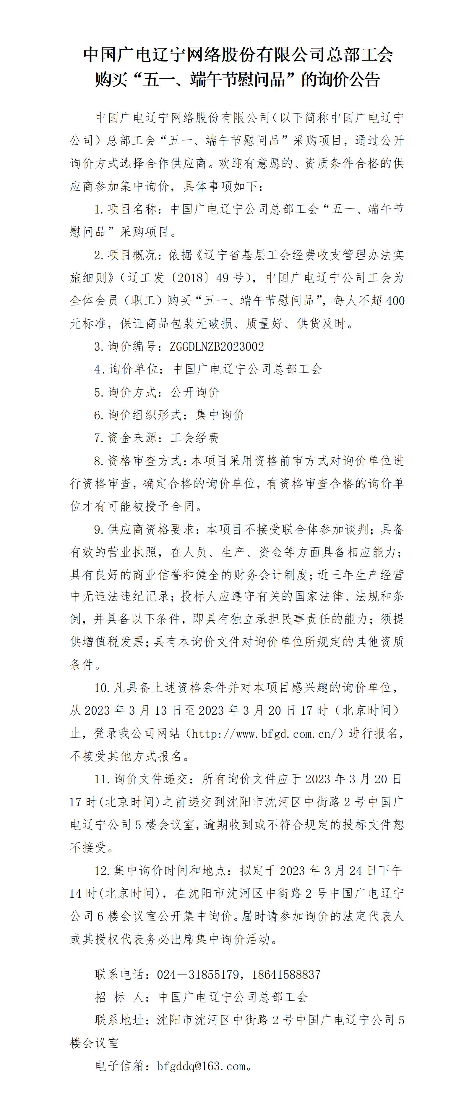 中国广电辽宁网络股份有限公司总部工会 购买“五一、端午节慰问品”的询价公告